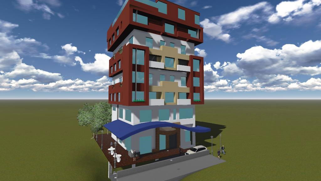 This 3D Boutique AutoCAD DWG drawing presents a detailed architectural model of a modern multi-storey commercial building. The design features a stylish elevation with dynamic geometric patterns, balcony placements, and a contemporary exterior façade ideal for boutique spaces or retail showrooms.