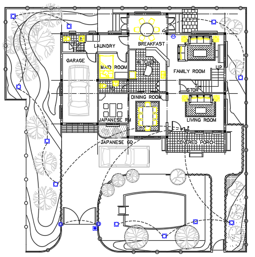 Interior floor plan of a bunglow with full detail of interiors from placing of furniture in all rooms and showing measurements.Interior floor plan of a bunglow