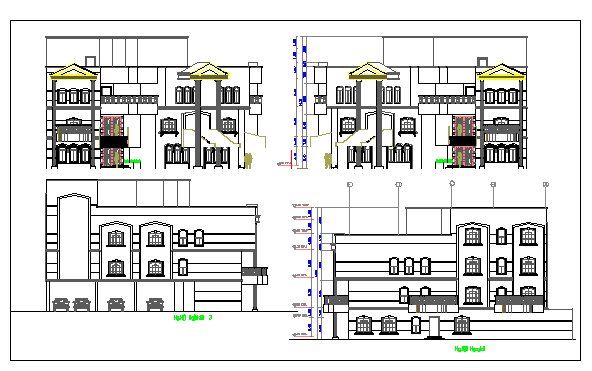 Exterior elevation of a building with detailed elevation showing design of building and also windows entrance door railings with all measurements.