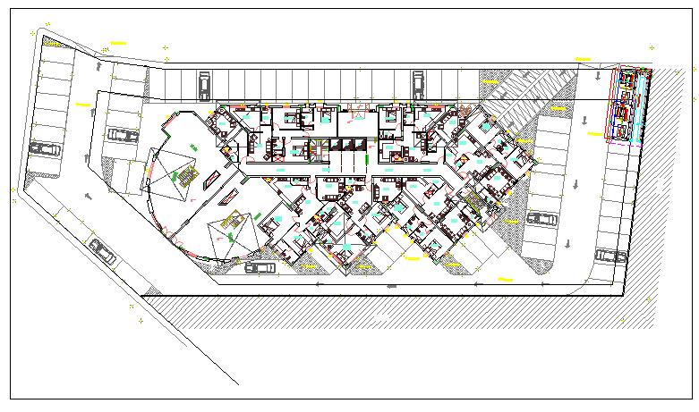 Floor plan of a hotel and restaurant showing all details of a interior of a hotel like arrangements of reception area waiting area entrance lobby dinner tables chairs with needed dimensions.
