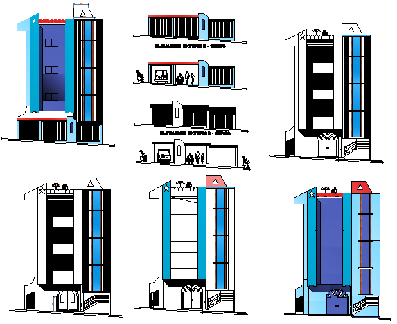 Building Interior and exterior elevation view dwg file, Building elevation and section view view of exterior viewed, building parking, building section view, building elevation view, building interior view