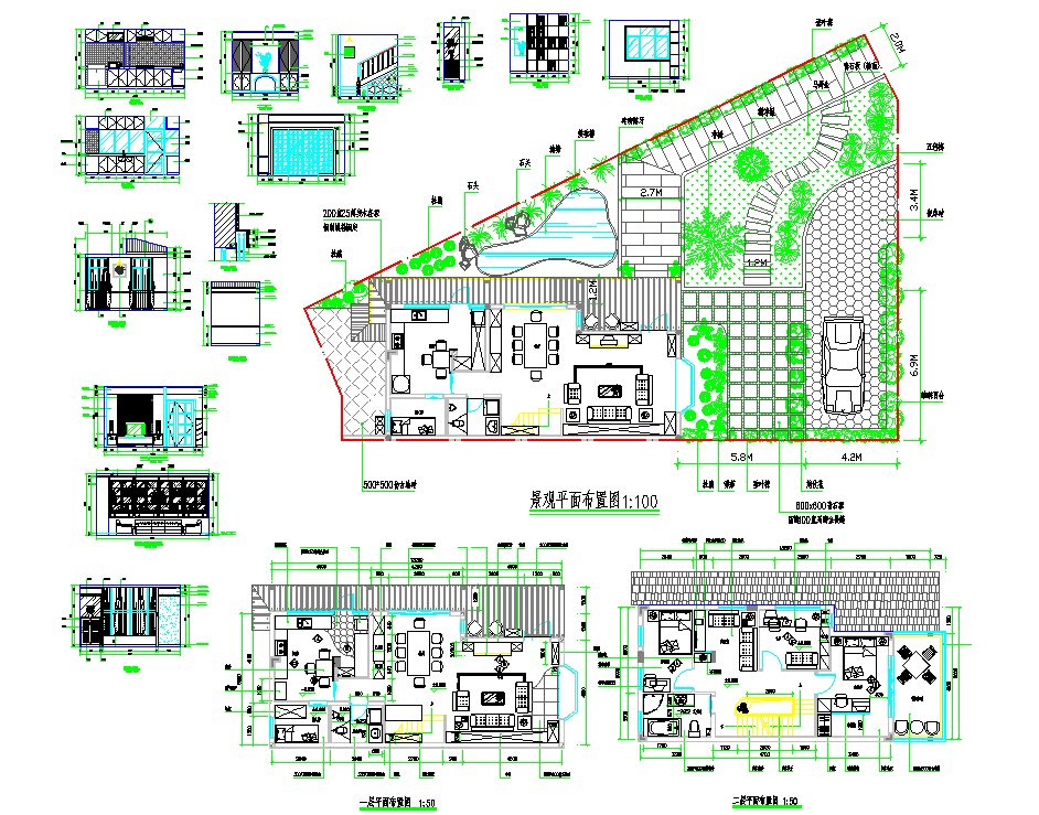 find here the architecture layout plan of the ground floor, first floor, and second floor with furniture detailing, garden landscaping design and swimming pool of luxurious project.