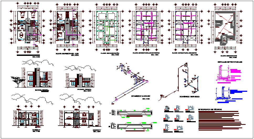 House plan design view with sectional and elevation view with view of structural,sanitary and hydraulic view dwg file