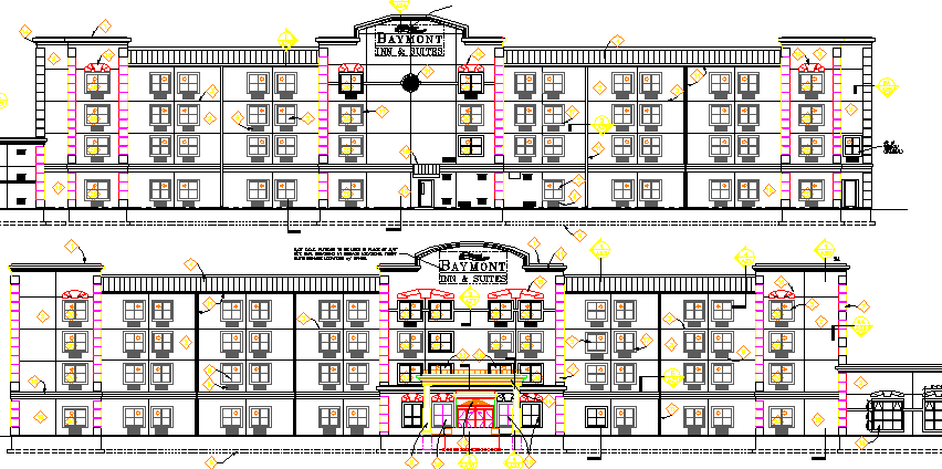 Five Star Hotel Project Front and Back Elevations dwg file.