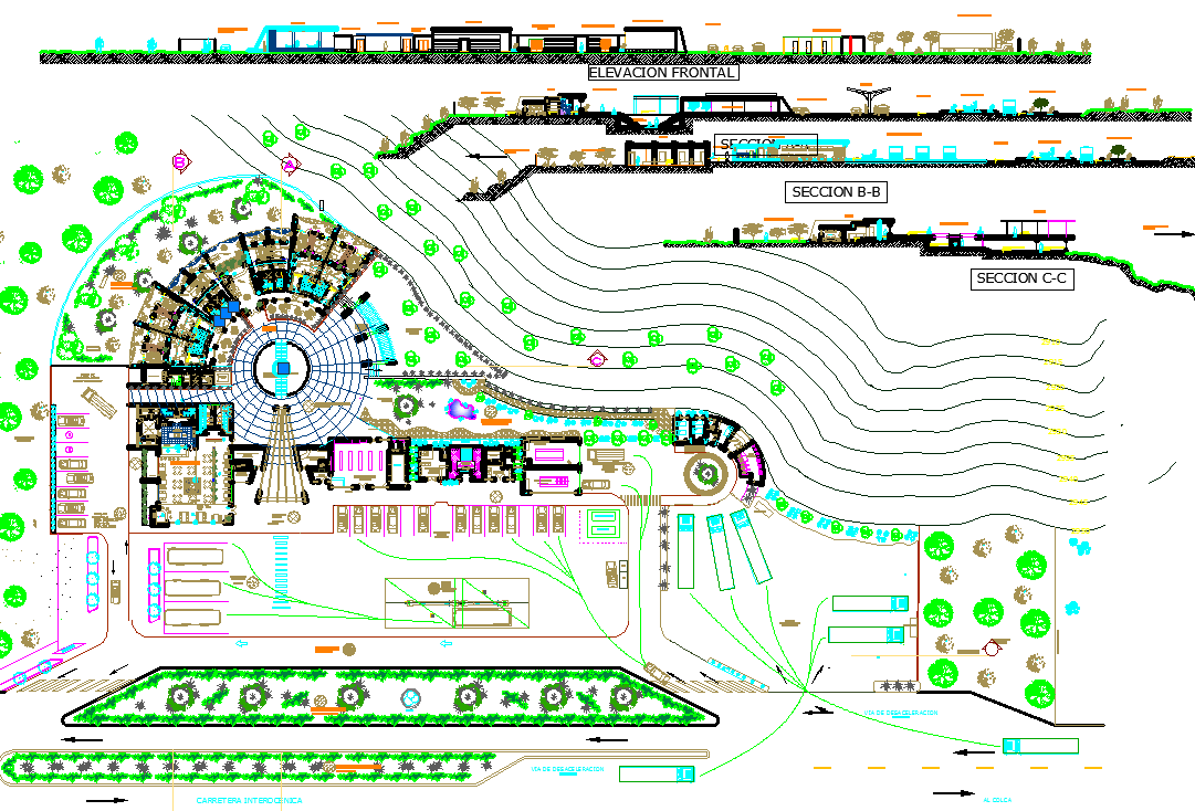 Resort Project detail dwg file. Resort project layout plan includes parking plan, restaurant, landscaping design, section plan and elevation design