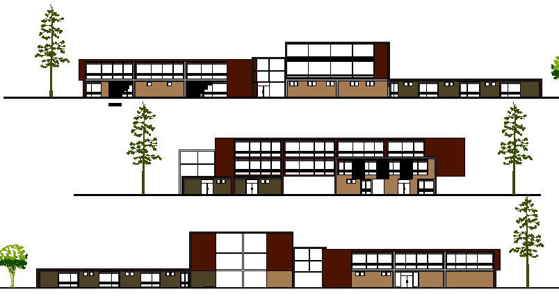 Multi-Flooring Hospital Design and Elevation that includes a detailed view of front and back elevations, tree view, doors and window elevation, roof view, staircase elevation, column and beam view and much more of hospital elevation.