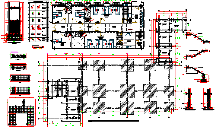 Treatment Pavilion Center Architecture Project that includes a detailed view of wall construction, wall measurements, material details, column and beam, roof view, staircase construction, pillars and much more of pavilion center design.