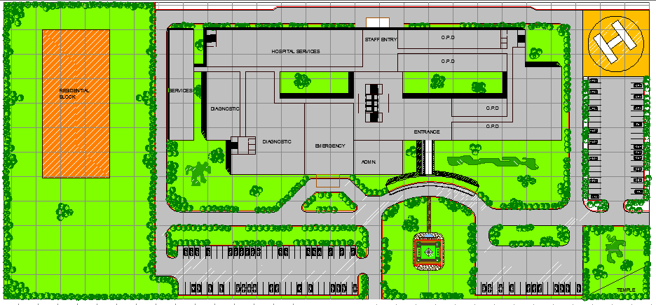 City Hospital Site Plan and Structure Details that includes a detailed view of temple, car parking area, roads, entrance, admin, emergency, diagnostic, opd, staff entry, hospital services, residential block and much more of city hospital site plan.