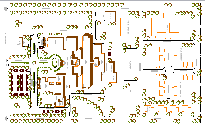 Multi-Specialty Hospital Site Plan that includes a detailed view of wide road, entry and exit gate, food court, opd entrance, roof, emergency entrance, auditorium, main building, court yard, services, laundry, community center, park, play ground and much more of site plan of hospital design.
