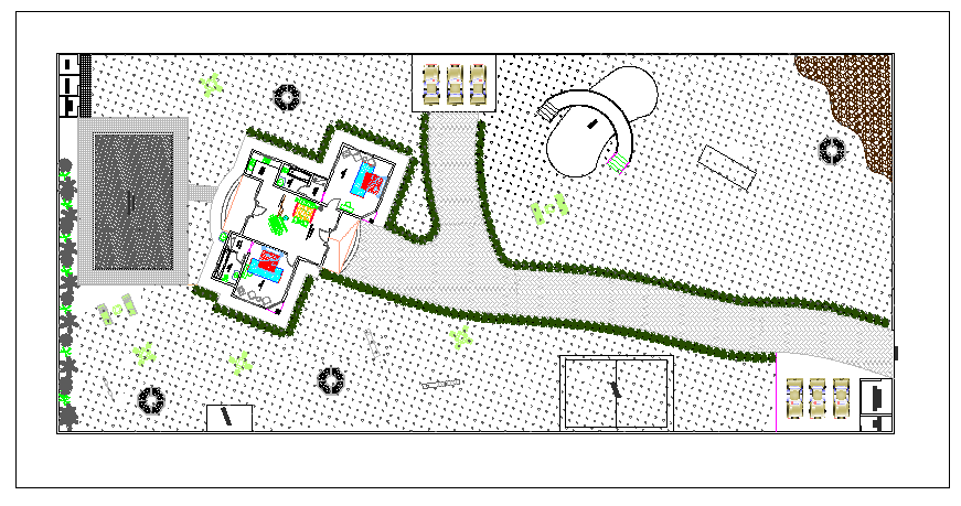 Layout plan and floor plan of a farm house with details of garden swimming pool play area for kids pathway parking and interior plan showing all the rooms with furniture placing and measurements .