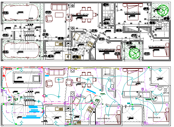 Multi-Family Housing Building Architecture Project that includes a detailed view of electric installation,structure details with family hall, living area, balcony, kitchen, dining area, terrace, bedroom, master bedroom, toilets and bathroom, passage, study room and much more of housing project.