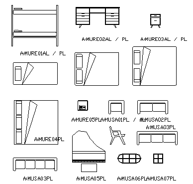 Common Furniture Blocks that includes beds, master beds, mini beds, dining table, table, chairs, study table, piano stand, sofa, window, door and much more of furniture blocks.