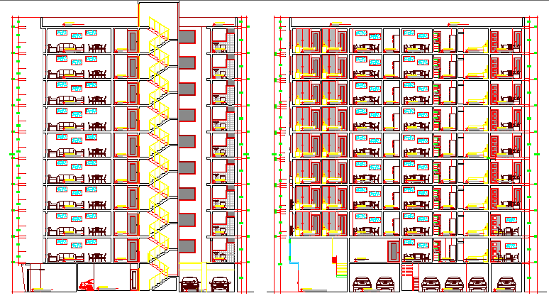 Section Details of Multi-Family Residential Building that includes front and back sections with basement car parking area with car view, floor wise staircase view, living room with dining area, toilets view, door view, wall view and much more of building section.