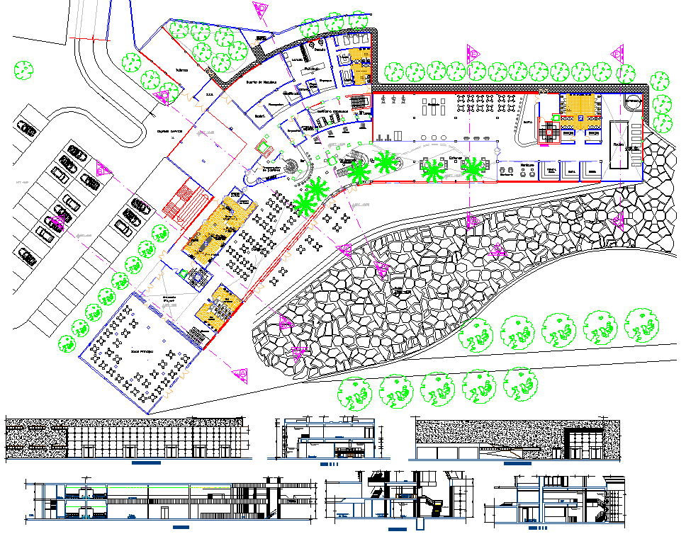 the architecture layout plan along with furniture arrangement, car parking, landscaping design, section plan and elevation design of resort project detail dwg file.
