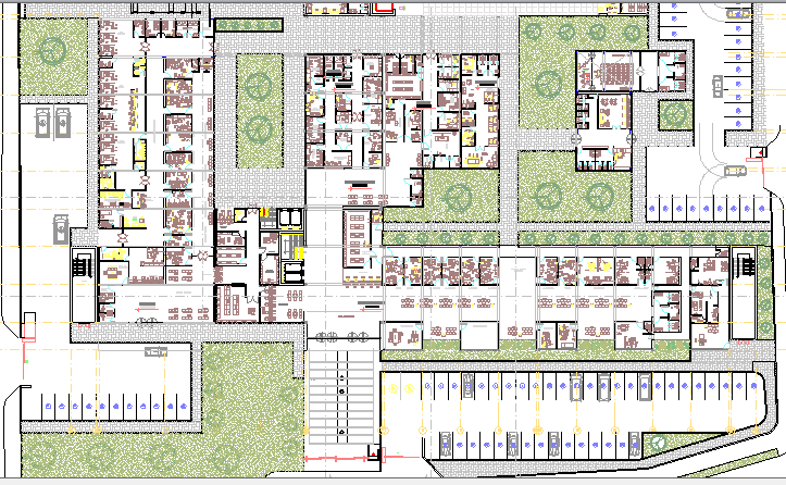 General Hospital Architecture Project that includes main entry gate, staircase, sitting area, dining area, kitchen, laundry area cleaning department, meeting room, doctor's cabin, consultant room, x-ray room, toilets for general and staff, patient room, waiting area, reception are and much more of hospital project design.