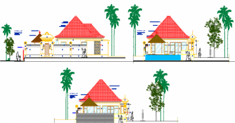 This beach house design CAD drawing provides a full residential layout suitable for architectural planning, drafting, and construction reference. The drawing includes complete floor plan details that show living spaces, bedroom layouts, kitchen planning, circulation zones, and access points. The design also contains all side rendered elevations, which help in understanding the exterior appearance, facade style, roof forms, and visual proportion of the building. Each elevation is drafted with clarity to show window alignment, door placement, wall structure, and height levels. Dimension details and annotation marks are included to support accurate reading and execution on site.