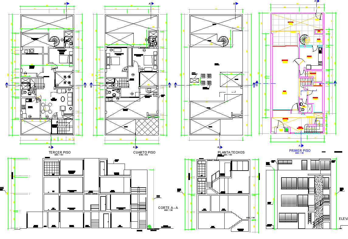the architecture layout plan all floor level along with furniture detailing, section plan and elevation design of 4 Story House project detail view in autocad file.