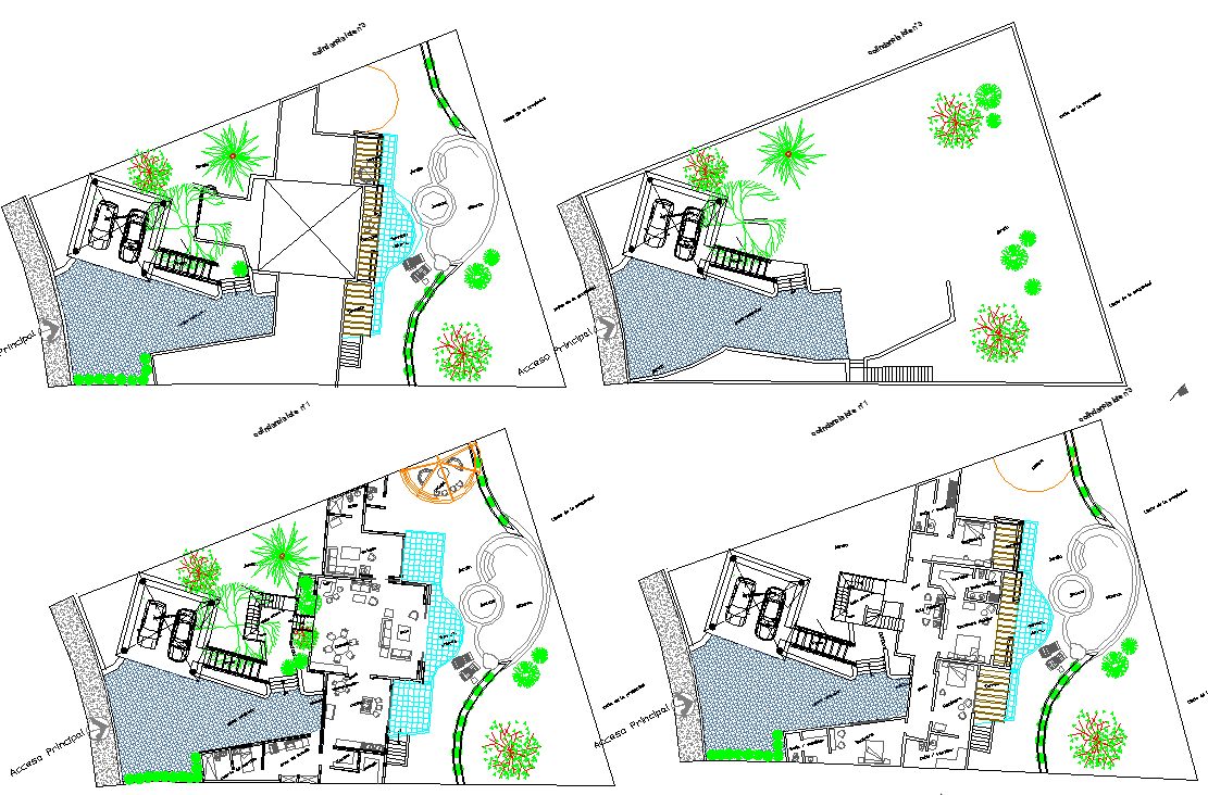 the architecture ground floor plan, first floor plan, terrace plan along with furniture detail and also have out side swimming pool design in autocad format.