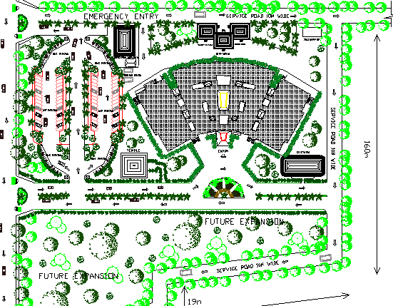 Site Plan of Genera Hospital Complex that includes outdoor and indoor wide roads, exit gate, entry gate with security check, car parking area, staff parking, ambulance parking, circle with center water area, garden, tree blocks, canteen, cafeteria, future expansion area, conference hall, consultant room, different specialist departments and much more of hospital site plan.