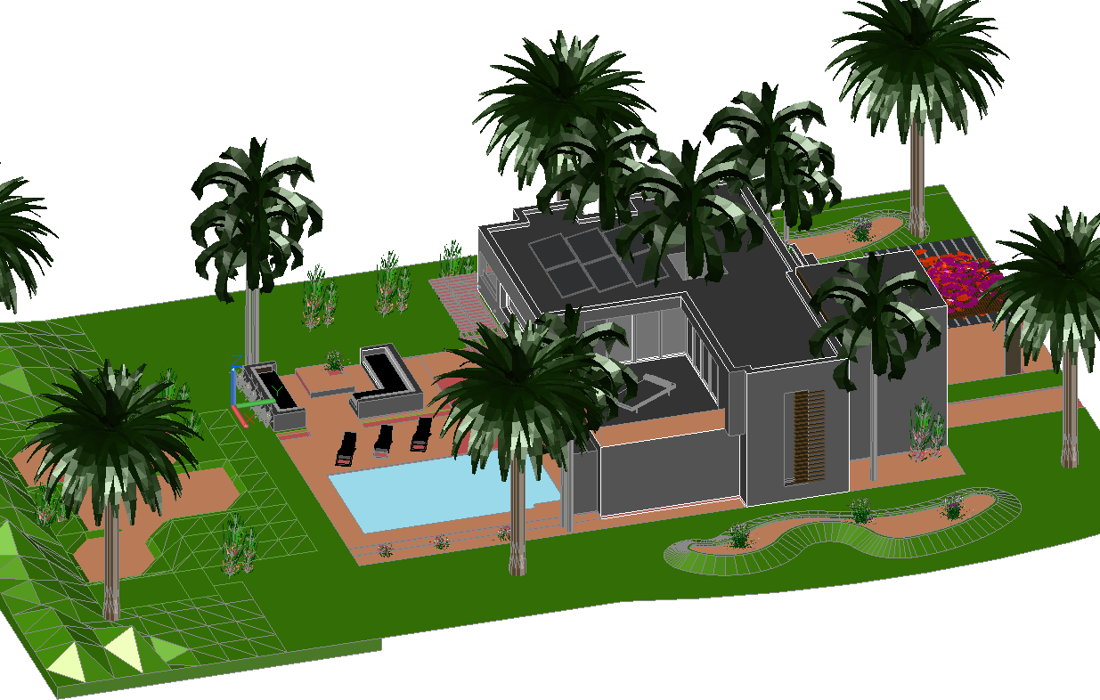 3d Luxurious house plan dwg file. 3d model of architecture house plan with landscaping design and swimming pool in autocad format