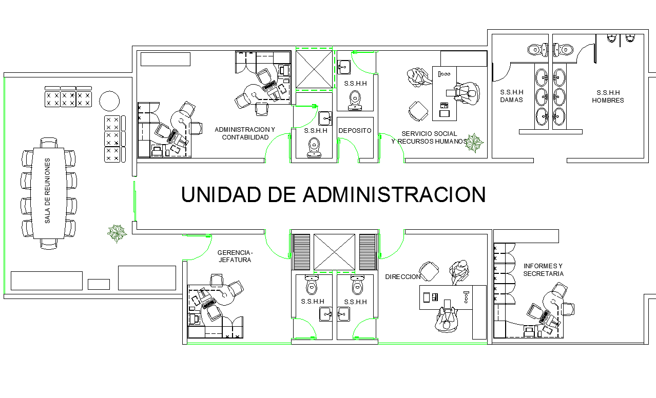 Administrative Unit project detail dwg file. layout plan includes administrative manager office, meeting room, washroom of Administrative Unit plan dwg file.