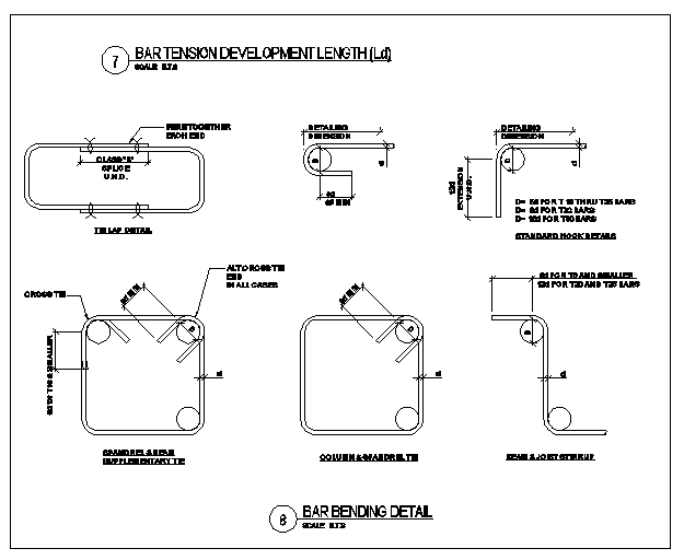 Column and beam structure detail showing column spandral tie beam and joint stirrup standard hooks bars supplementary tie with measurements.