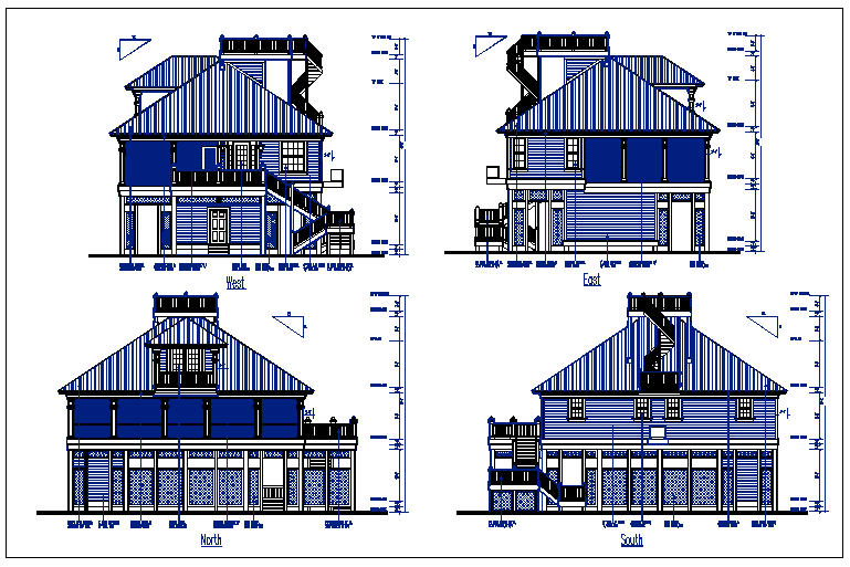 Architecture House All Side Elevation Detail in cad file West , East, north , South all direction elevation detail. and all floor detail include.
