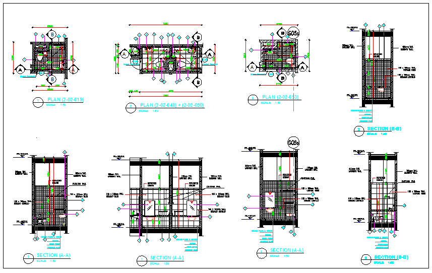 Toilets room planning elevation section plan dwg file, toilet room beam column wall thickness detail , water proofing detail, mortar information on flooring, door window dimensions where place dimensions, mortar detail, toilet room planning design drawing, wall dimensions , wall detail ceiling height ratio detail, ceramic tile used information