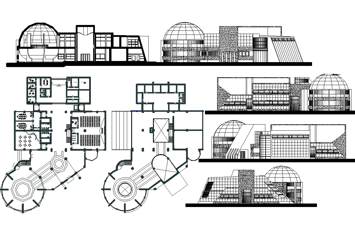 the architecture museum layout plan of the ground floor plan and first-floor plan along with furniture detail, section plan, and elevation design.