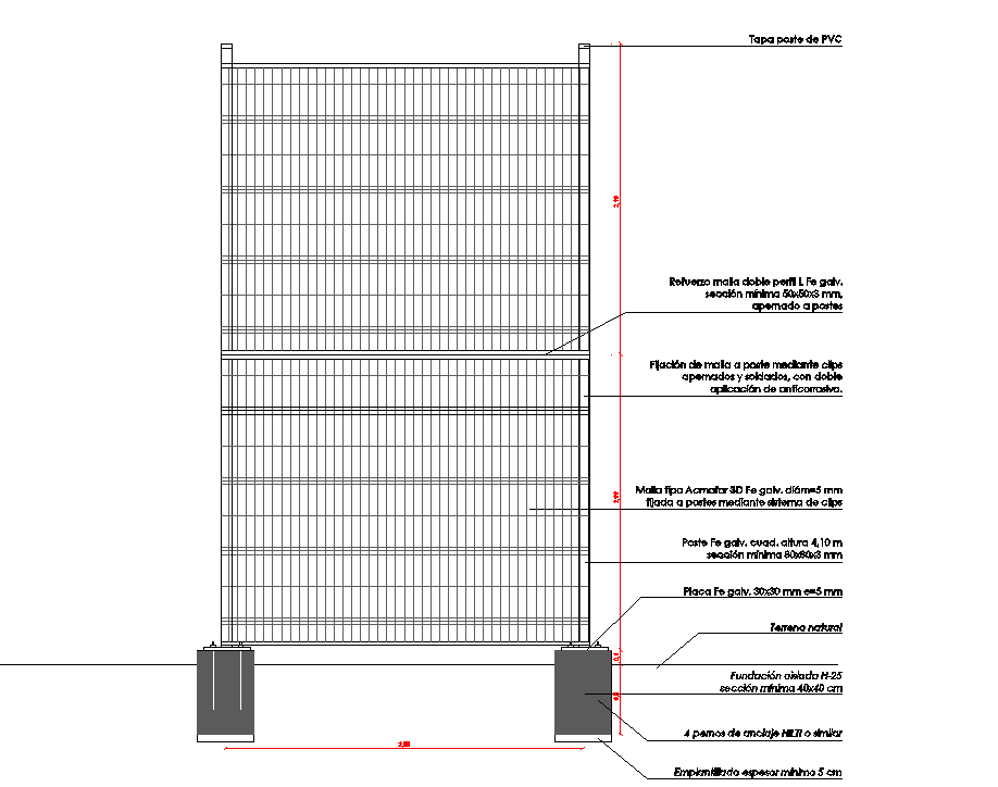 This Closing Multicourt AutoCAD DWG drawing presents a detailed 2D sectional layout ideal for sports court fencing and structural boundary planning. The drawing includes comprehensive dimensions, reinforcement details, mesh fixing methods, and foundation specifications for durable and safe court enclosures. It features the arrangement of galvanized steel posts, anchor reinforcements, PVC caps, and fixed 3D wire mesh panels with accurate height and spacing details. Each structural component, including base plates and concrete footings, is dimensioned to ensure ease of fabrication and installation.