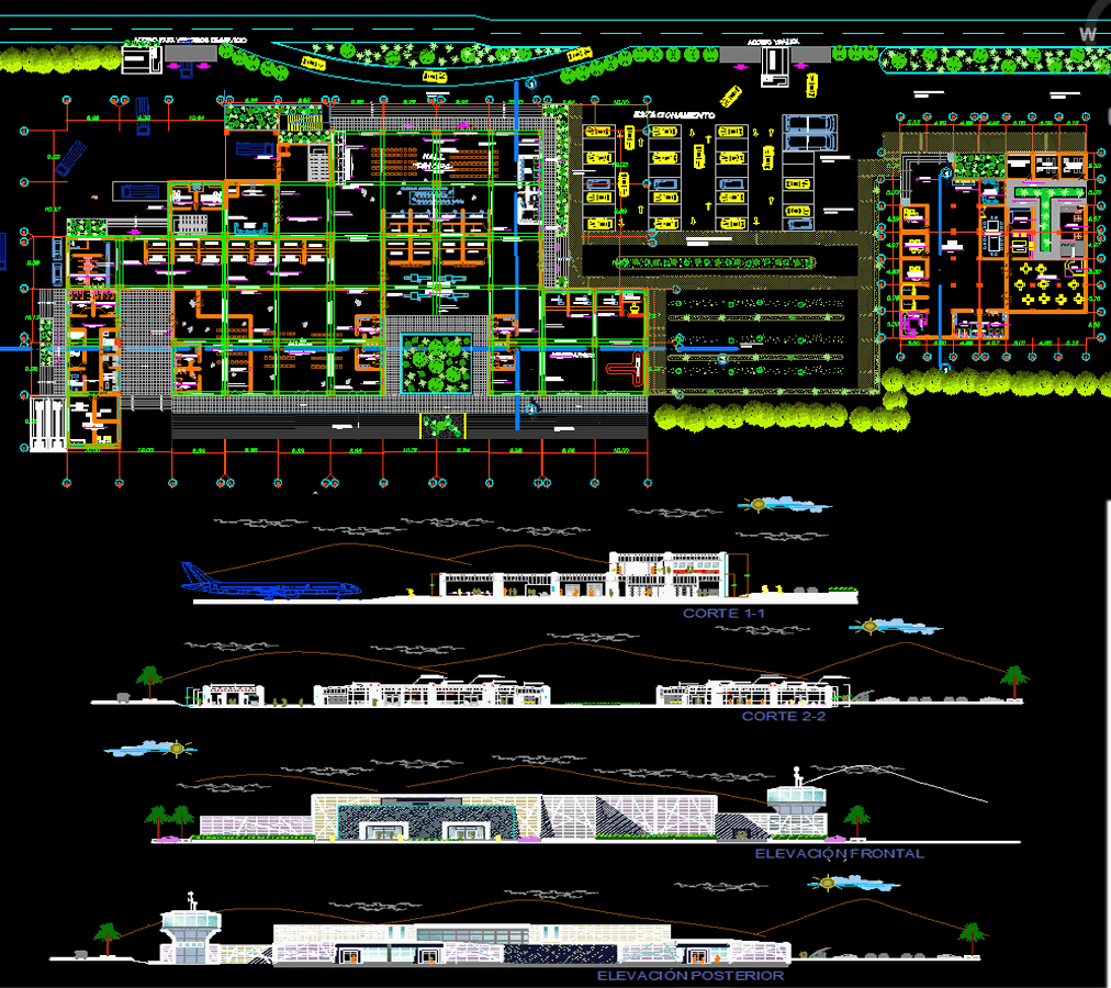 This CAD DWG file features a detailed Peru airport section and elevation layout, showcasing the complete architectural and structural design of the terminal building. The plan includes sectional views highlighting the runway, passenger waiting lounges, check-in counters, and baggage handling zones. The front and rear elevation drawings clearly depict the airport’s façade, terminal entry, and connected structures. This CAD file also provides the layout of essential spaces such as restrooms, ticket counters, customs areas, and control sections, designed with precise dimensioning for professional use.