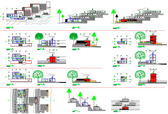 This clubhouse CAD drawing provides a complete set of 2d design details suitable for architectural planning and construction development. The drawing includes well-organized floor plans that outline spatial layout, room distribution, circulation areas, and functional zoning. Sectional views help illustrate height alignment, structural support, and internal arrangement, giving clarity for execution and material interpretation. Elevation views present the external appearance and façade detailing to support design presentation and approval processes. These drawings can be used for visualization, planning, and coordination during project development stages.