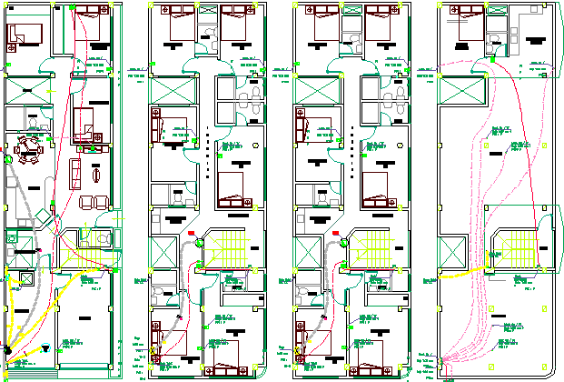 Electric Installation of Four Floors of Housing Project that includes a detailed view of ground floor installation, first floor installation, second floor installation, terrace installation, cable, size and details, monitor control box, dual box view, substitute cables, switches, indoor electric elements and much more of electric installation.