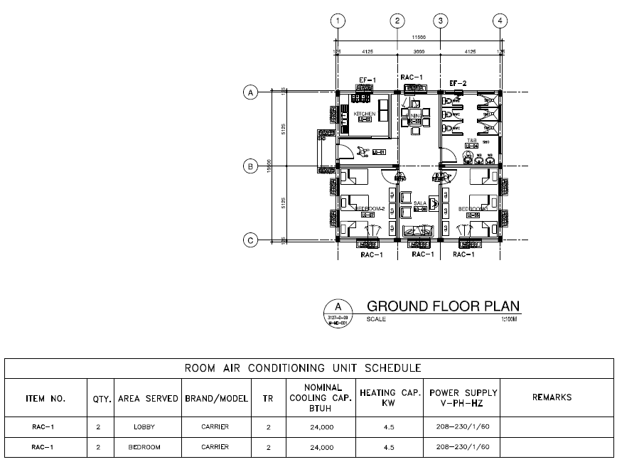 find here room air conditioning unit schedule, a layout plan of ground floor includes 2 bedrooms, kitchen, dining area, drawing room, and bathroom with furniture arrangement plan.