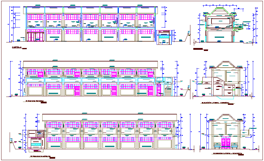 Different axis sectional view and elevation view of collage dwg file with view of section