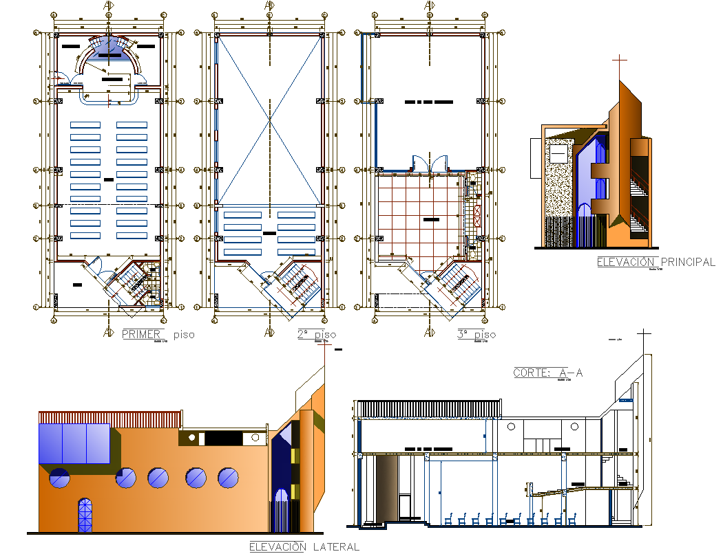 the architecture layout plan of the ground floor plan, first-floor plan, second-floor plan, section plan, front and side elevation design of Church Project dwg file