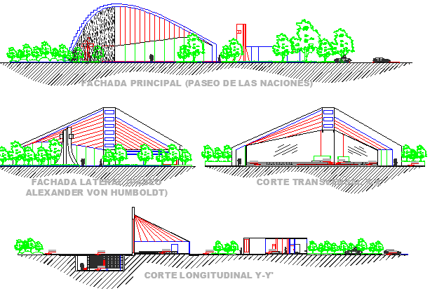 Paris Sports Center All Sides Elevation Details that includes front elevation, back elevation, all sided elevation, doors and windows view, tomb view, tree view, footing view, roof view, wall decoration and design and much more of sports center elevation.