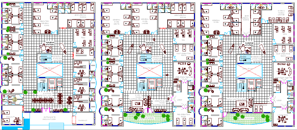 Ground floor, firs floor and second floor plan of hospital project dwg file