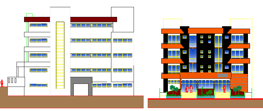 Private clinic and office main elevation view that includes front elevation, back elevation, doors and windows, staircase view, floor view, wall design, balcony, floor and roof view and much more of clinic elevation.