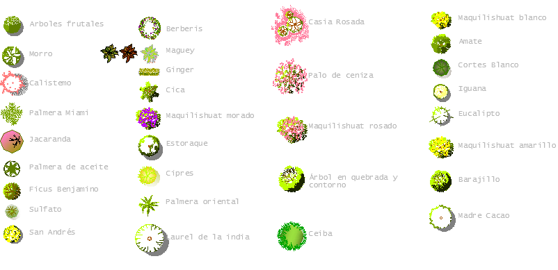 Common tree blocks and symbols that includes arboles frutales, morro, berberis, maguey, ginger, cica, calistemo and much more of tree blocks.