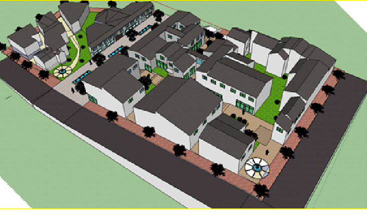 3D design of rehabilitation of apple top view that includes a detailed view of top view, roof details, doors and window view, balcony view, outdoor garden and landscaping and much more of rehabilitation center.