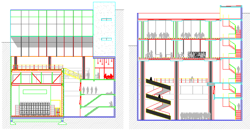 Dance school architecture design and sectional view that includes a detailed view of left section view, right section view, staircase view, floor view, cafeteria, balcony, performance hall, control room, admission office and much more of dance school section.