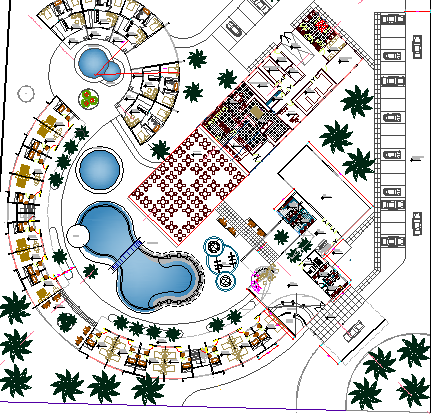 Five star hotel landscaping and structure details that includes outdoor and indoor garden area, sports ground, roads, swimming pool, changing room, game center, car parking area, reception area, waiting and sitting lounge, garden cafeteria, restaurant, dining area, single bedroom, master bedrooms, kitchen, laundry area, toilets and bathroom, admin area, control room, terrace cafeteria and much more of hotel structure.