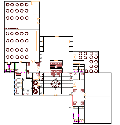 Second floor plan of multi-flooring hotel design that includes admin office, cafeteria, passage, general hall, family dining area, general toilet, reception, cafeteria, waiting lounge, sitting area and much more of second floor plan details.