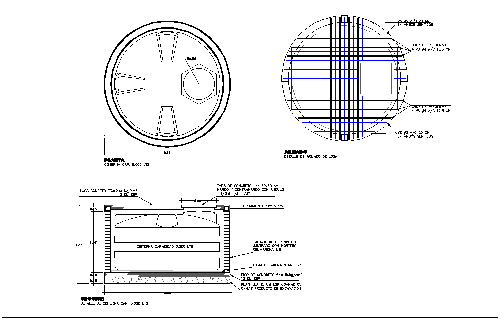 Water tank detail dwg file, water tank plan area and section area, elevation area detail denotation and naming detail, 5000 liter water tank detail, concrete detail, manhole detail, side wall for water tank and upper floor for cove raging water cistern etc