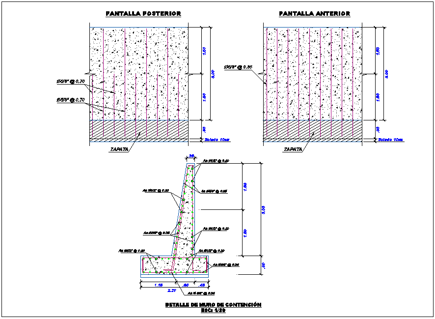 Retaining wall section view dwg file, Retaining wall section view, retaining wall structure information in detail, reinforcement detail structure, steel bars detail, main steel and distribution steel detail, detail dimensions of retaining wall section view etc