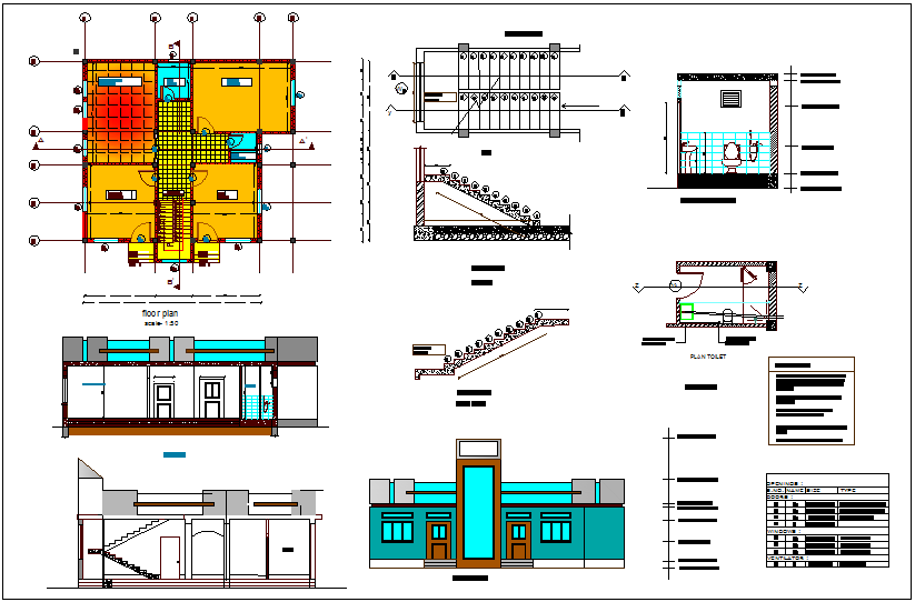 House plan,elevation and section view with door,window and sanitary detail dwg file