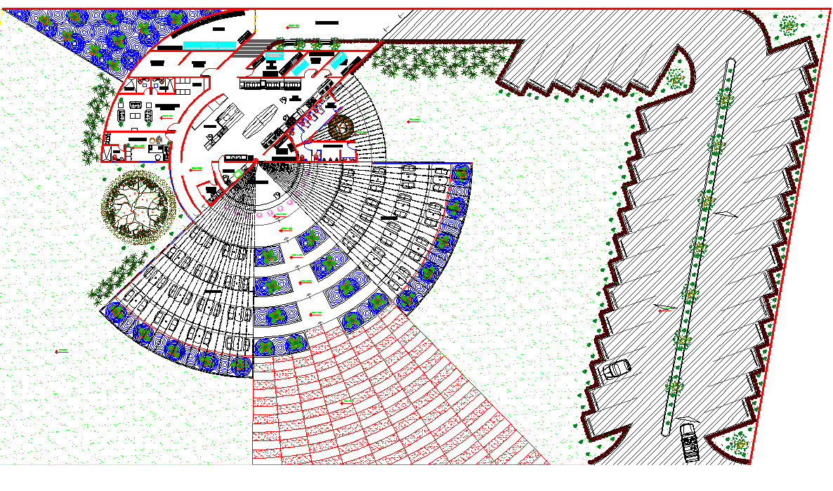 Resort Layout plan dwg file. architecture layout plan along with furniture detail, dining area, office cabin, parking area, and landscaping design.