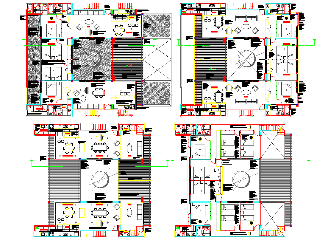 the architecture layout plan includes 4 bedrooms, modular kitchen, dining area, and along with furniture detail in autocad format.