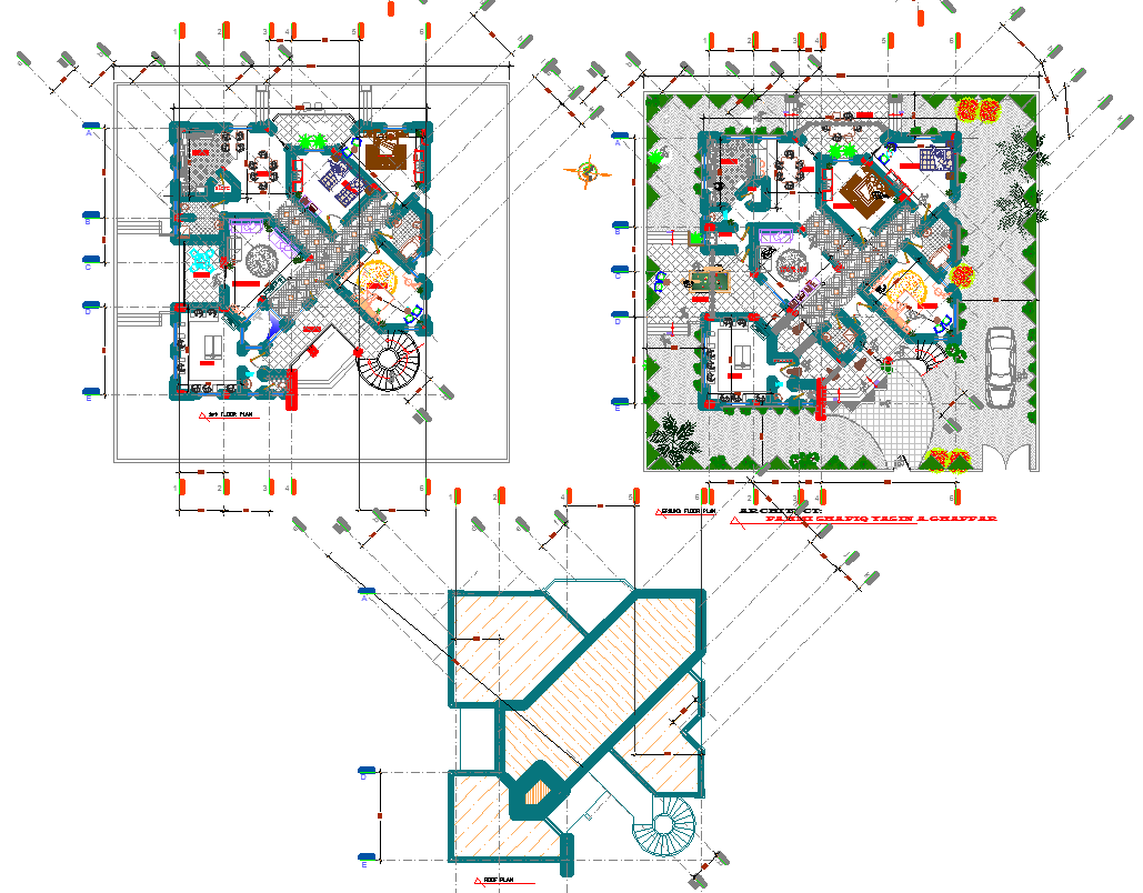Luxurious Residence Layout plan dwg file. the architecture layout plan of ground floor plan, first floor plan and roof plan of Luxurious Residence project detail dwg file.